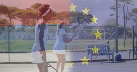 Young female tennis player standing smiling by net at sunset with digital data overlays
