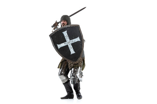 Portrait of brutal serious man, medieval warrior or knight in protective covering with sword preparing to attack isolated over white studio background