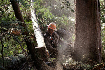 A timber faller works alone in the woods at Winter Harbor in Southeast Alaska, Alaska, USA