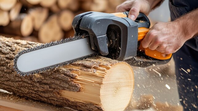Woodcutter operates a chainsaw at a sawmill, cutting through a large tree trunk - capturing raw power, precision, and the rugged essence of traditional woodcutting and forestry work