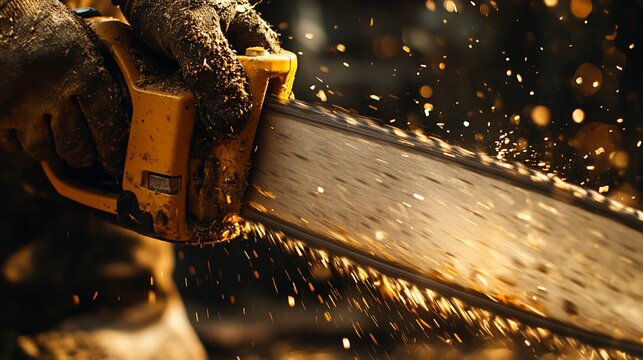 Chainsaw and Timber: A close-up shot of a powerful chainsaw ready for action, positioned in front of a pile of freshly cut timber, bathed in natural sunlight.