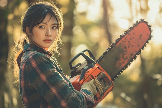 Confident woman with chainsaw in sunlit forest