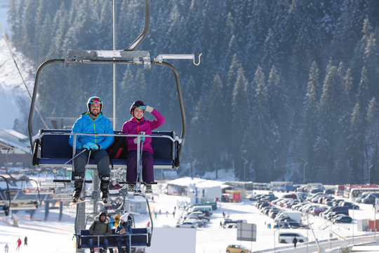 People using chairlift at mountain ski resort. Winter vacation