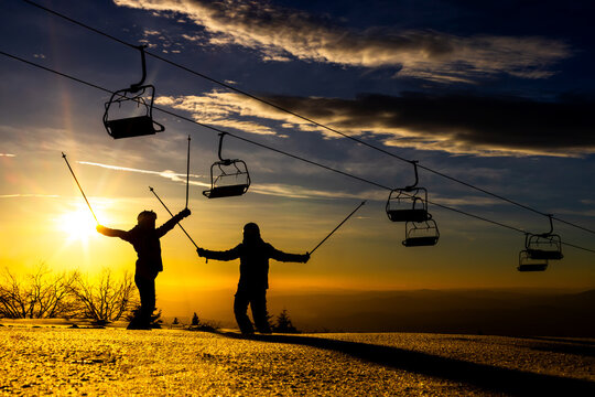 Skiers celebrating a beautiful sunset on a snowy mountain with scenic chairlifts