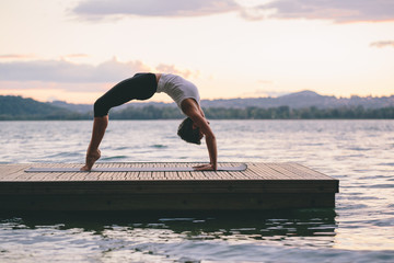 Athletic fitness woman practicing wheel pose , chakrasana or urdhva dhanurasana.Female wearing sportswear working out, at the beach,outdoors lifestyle fitness exercises training concept
