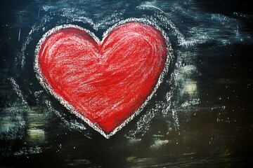 High-definition photo of a red heart chalk drawing on a blackboard, with chalk dust partially smudged for a vintage effect.