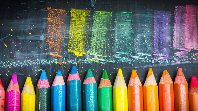 Colorful crayons on the blackboard, drawing. Back to school background.