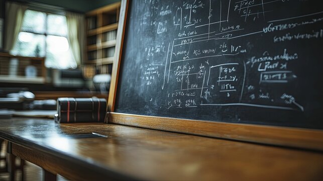 Educational Classroom with Chalkboard Filled with Complex Mathematical Equations and Textbooks