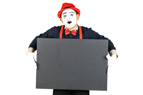 happy artist MIM is holding a black Board on a white background