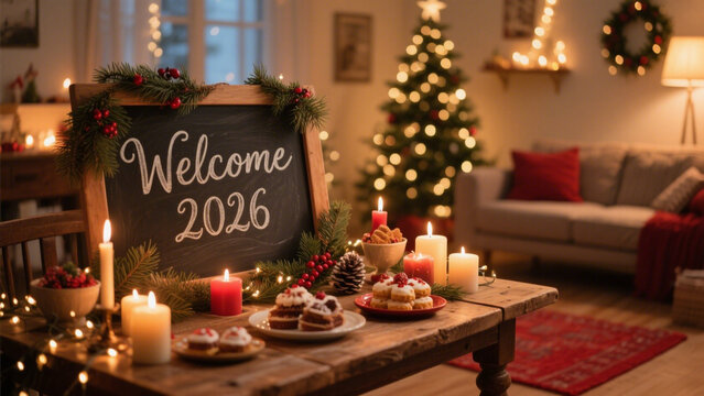 A chalkboard sign reads 'Welcome 2026' in elegant cursive lettering, surrounded by pine branches, berries, and twinkling lights. Happy New Year, Happy New Year 2026, Merry Christmas And Happy New Year