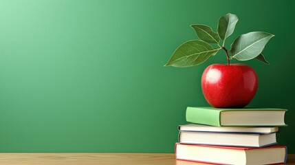 Apple on books, green chalkboard background; education concept