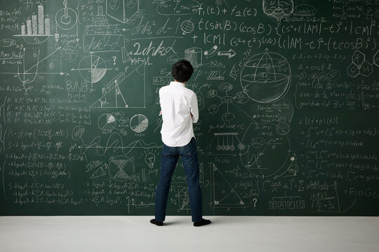 Man looks at chalkboard covered in complex mathematical equations and diagrams.