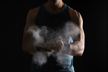 Fitness, athlete and hands with powder in gym for exercise grip, muscle training and workout routine. Bodybuilder, person and chalk dust at sports center for weightlifting practice and preparation