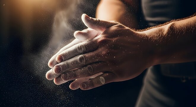 Close up of chalk dusted hands gripping a bar symbolizing strength and determination in fitness