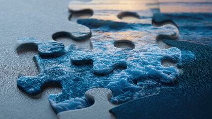 Gathering puzzle pieces depicting waves at sunset with focus on water textures and colors, capturing the merging of image and puzzle details