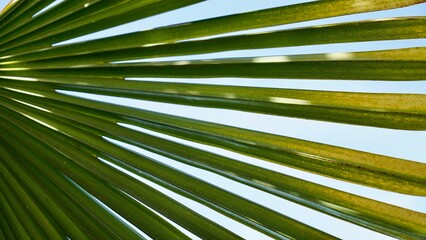 Fan-shaped leaves of Chamaerops humilis against sky. European Fan Palm, Mediterranean Fan Palm Frond Close-up