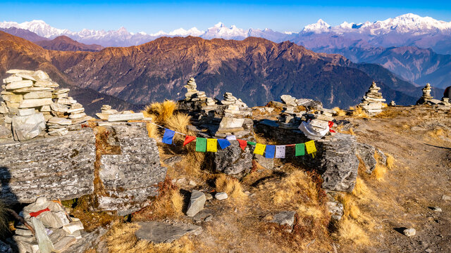 Prayer flags at Chandrashila summit of Deoria tal,tungnath chandrashila trekk in India Himalayas near Chopta Uttrakhand India.