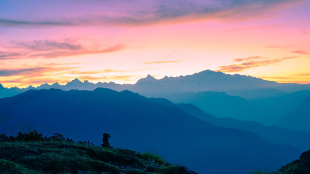 Beautiful panoramic landscape view of the sunrise at Himalayan snow mountains from Chandrashila peak in Chopta, Uttarakhand, India,.