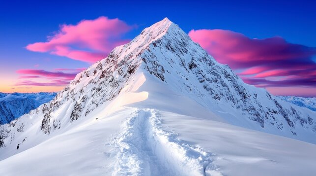 Snow covered mountain peak at sunrise with winter landscape view of chandrashila mountain