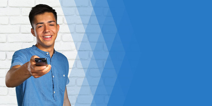 Hand holding remote control while changing channels on modern smart television in cozy living room with colorful blurred screen