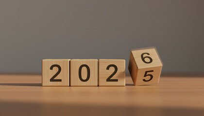 Wooden blocks show the year changing from 2025 to 2026 for new year celebrations and business planning