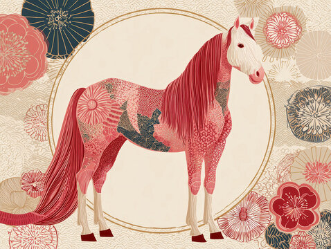 Stylized illustration of a pink and red horse in profile, surrounded by swirling abstract floral elements Flowers vary in size and color, with some matching the horses hues and others - AI-Generated
