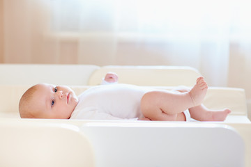 Newborn baby girl lying on changing table