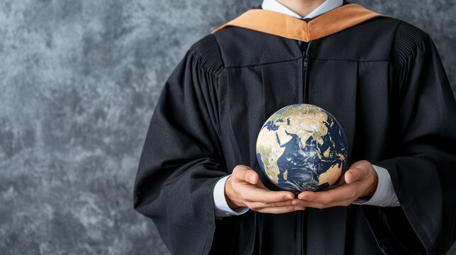 A graduate in a gown holds a globe, symbolizing education and global awareness.
