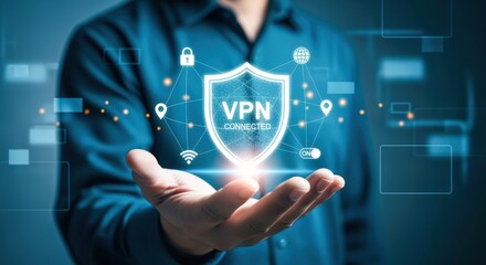 VPN Network Security Concept: Person Holding Shield Displaying Virtual Private Network Connection and Secure Data