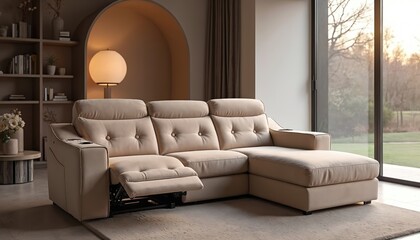 Elegant Beige Channel Tufted Sofa and Modern Floor Lamp with Classical Bust Accent in a Serene Living Space
