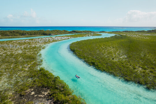 Aerial view of the turquoise channel cuts sharply through the sandy and rocky expanse, creating a stunning contrast of colors and textures, Whitsundays, Queensland, Australia.