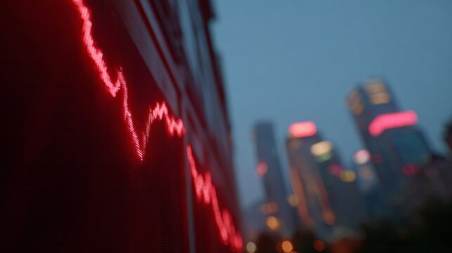 Neon red stock market graph dances amidst an urban skyline, embodying financial volatility, Global Finance Day, and chaos theory