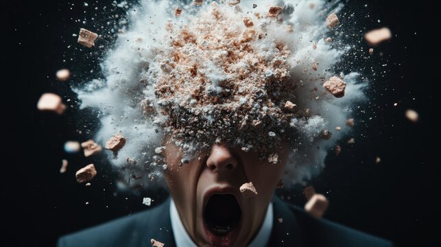 Stressed office worker, chaotic desk, papers flying, intense expression, high energy, wide shot