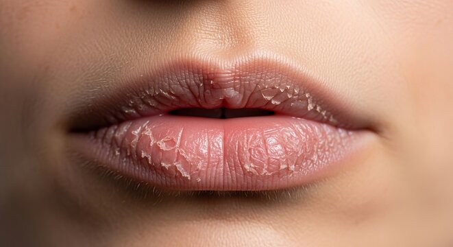 Closeup of chapped lips with a visible sore, woman pressing fingers against her mouth, discomfort expression, hyperrealistic shot