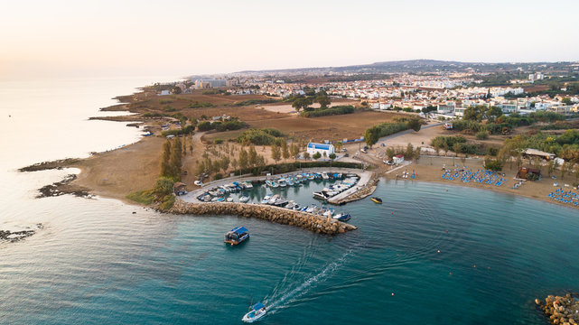 Aerial bird's eye view of coastline sunset, landmark white washed chapel Agia Triada beach, Protaras, Famagusta, Cyprus from above. Ayia Trias bay church and a boat out of the small port at sunrise.