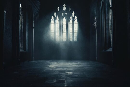 Empty dark room in Gothic style with large windows eerie and atmospheric interior grand architectural details mysterious ambiance dramatic lighting and shadows medieval design elements spacious and ha