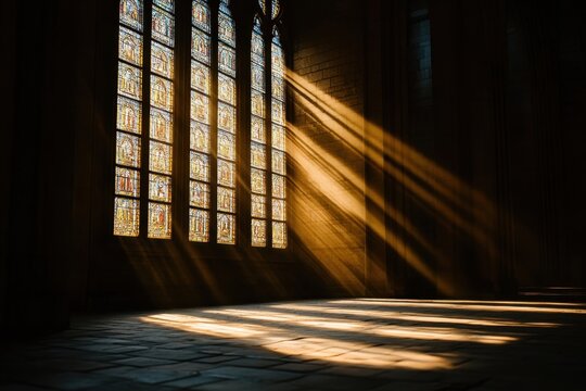 Light streams through gothic windows, illuminating an empty hall. The golden rays create a serene atmosphere in the grand, cavernous space.