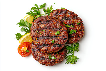 Afghan Chapli Kebab isolated on neutral plate, flattened burger with tomato and onion slices, red light features meat color, clean environment, blurred barbecue utensils.