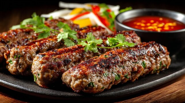 Delicious traditional chapli kebab with spicy sauce and fresh cilantro garnish for culinary inspiration.
