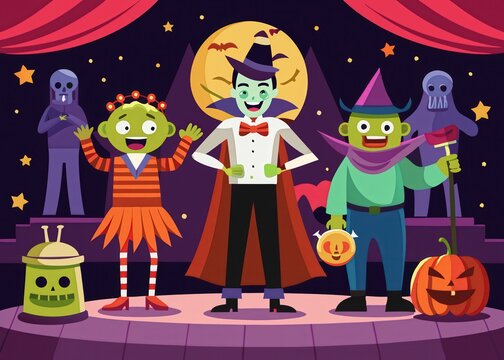 Whimsical Thanksgiving dinner scene with animated characters enjoying a feast with turkey pies and autumn decorations