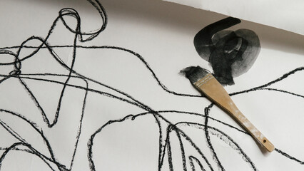 Close up detail of a variety of drawing media an artist or drawer would use creatively. Charcoal, pencils, sharpener and other artistic products on a table being used. Art equipment on a table.