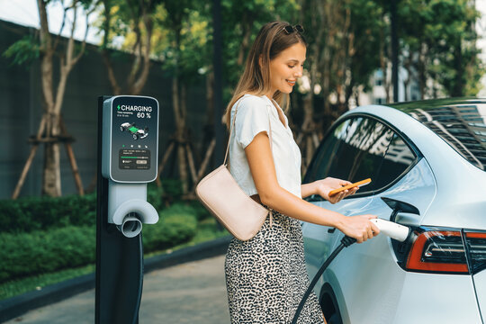 Young woman travel with EV electric car charging in green sustainable city outdoor garden in summer. Urban sustainability lifestyle by green clean rechargeable energy of electric BEV vehicle innards