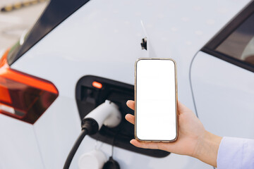 Focus EV charger pointing in front of camera display smart digital battery status hologram with blur businessman background. EV car charger using alternative clean energy reducing CO2 emission. Peruse