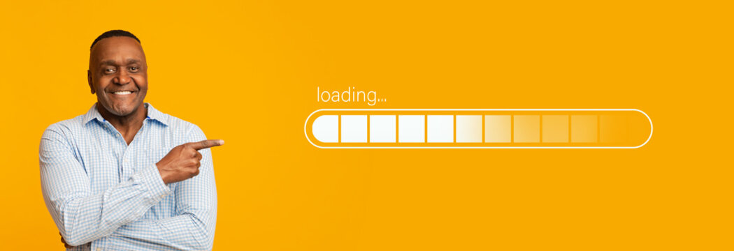 Mature African American man pointing aside at loading process bar over orange studio background, banner design