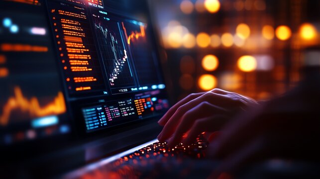 Hands typing on a laptop with graphs displayed.