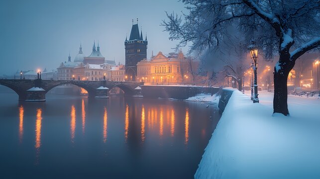 Foggy morning stroll on Charles Bridge with historic architecture and illuminated lanterns in Prague