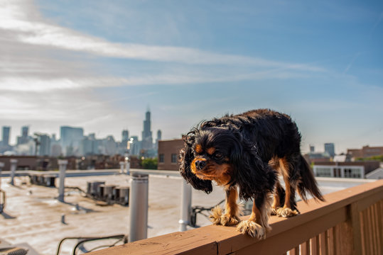A beautiful Cavalier King Charles Spaniel dog walks across a narrow ledge in front of the Chicago skyline, on a rooftop in the city. Concept of braving danger and facing fears.