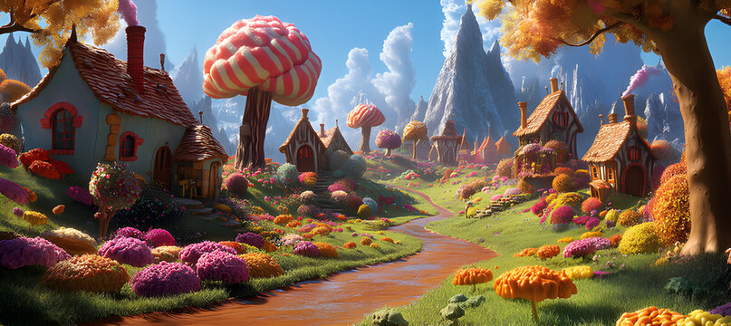 A natural scene filled with the spirit of cartoons such as Alice in Wonderland or Charlie and the Chocolate Factory. A village in the distance has houses made out of gingerbread.