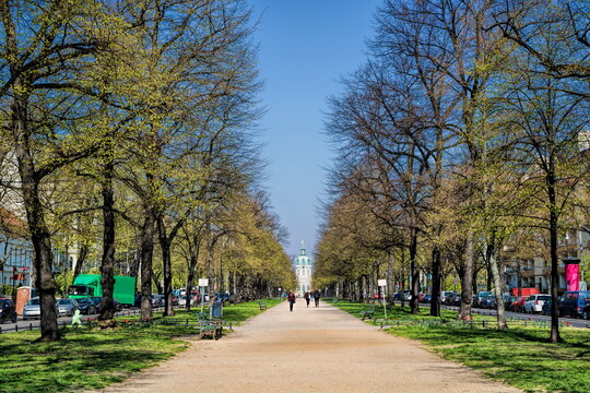 berlin, deutschland - 09.04.2019 - baumallee in der schloßstraße in berlin charlottenburg