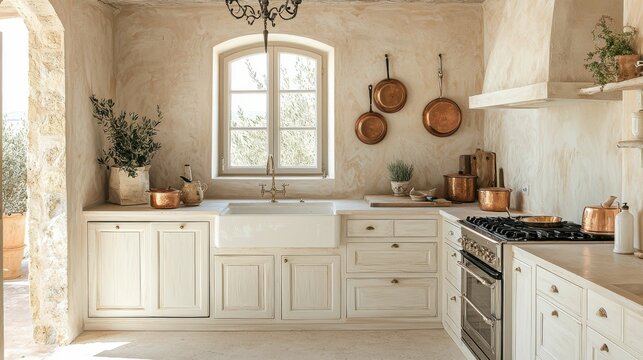 A charming European farmhouse kitchen featuring rustic cabinets, copper pans, and a cozy atmosphere. It blends vintage design with natural materials.